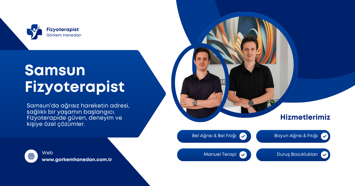 Samsun’da sunulan fizyoterapist hizmetleri, bireylerin ihtiyaçlarına göre şekillenen geniş bir yelpazeye sahiptir. Fzt. Görkem HANEDAN’ın kliniğinde bel ve boyun ağrıları, fıtık problemleri, manuel terapi uygulamaları, duruş bozuklukları, skolyoz tedavileri, karpal tünel sendromu ve diz rehabilitasyonu gibi alanlarda profesyonel destek sağlanmaktadır. Her danışan detaylı bir değerlendirme sürecinden geçirilerek şikâyetlerin kaynağı doğru şekilde analiz edilir.